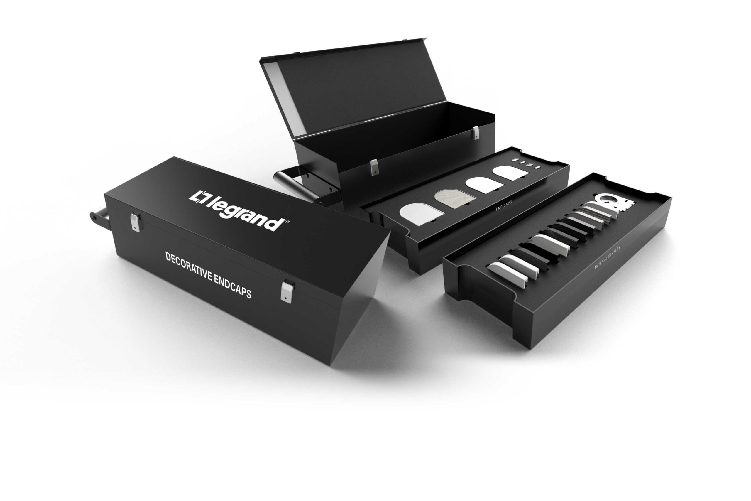 The demo case by Legrand showcases a variety of finishes, enhancing the buying experience. Made of durable powder-coated aluminum, it features two removable trays for easy display. The case also showcases the seamless integration of Decorative Endcaps and hembar endcaps with open roll brackets, enhancing the product’s aesthetic appeal.