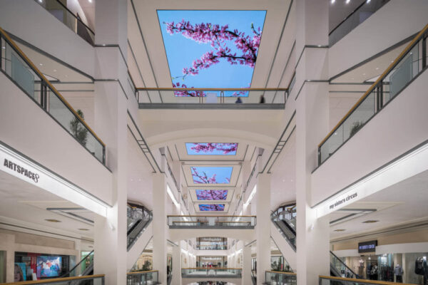 DVLED signage designs can also provide front or rear (or both) access options for simplified module maintenance. In the case of the DVLED installation at the 900 North Michigan Shops in Chicago, Illinois, ESI Design worked with Mitsubishi Electric to deliver its transformation of the retail outlet’s interior by creating virtual skylights that feature artistic and advertising content. The display system features Mitsubishi Electric’s direct-view LED display technology, including nine 19.32′ x 19.32′ displays and one 19.32′ x 10.08′ display, all featuring a 4.00mm pixel pitch of LEDs sourced from a single bin to provide uniform lighting and color characteristics. A custom hoist system allows the displays to be lowered 85′ to floor level for maintenance and module access.