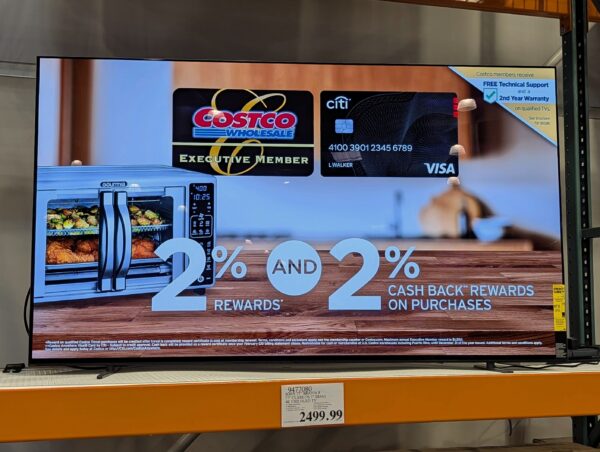 The membership-only retail store known as Costco is an example of a business that blends digital signage into the shopping experience as a cost-effective means to deliver in-store advertising and assistance with self-checkout purchasing. The warehouse store is known for its database-derived, printed pricing signs, which staff affix next to individual items. However, the company leverages its offering of consumer televisions, typically located near the entrance, by incorporating offers for upgraded membership benefits, credit card-related bonuses, and website promotions into the looped video feed of the otherwise eye-catching imagery.